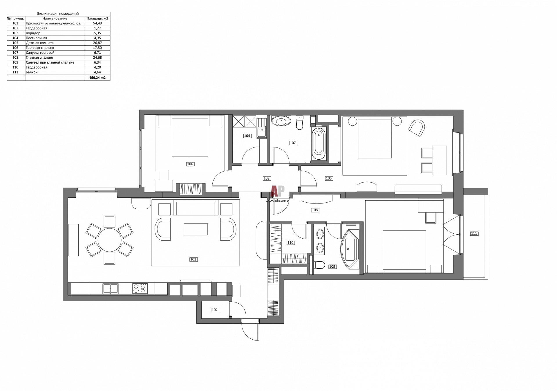 Вариант планировки квартиры до 160 кв. м с небольшой плоскостью остекления.
