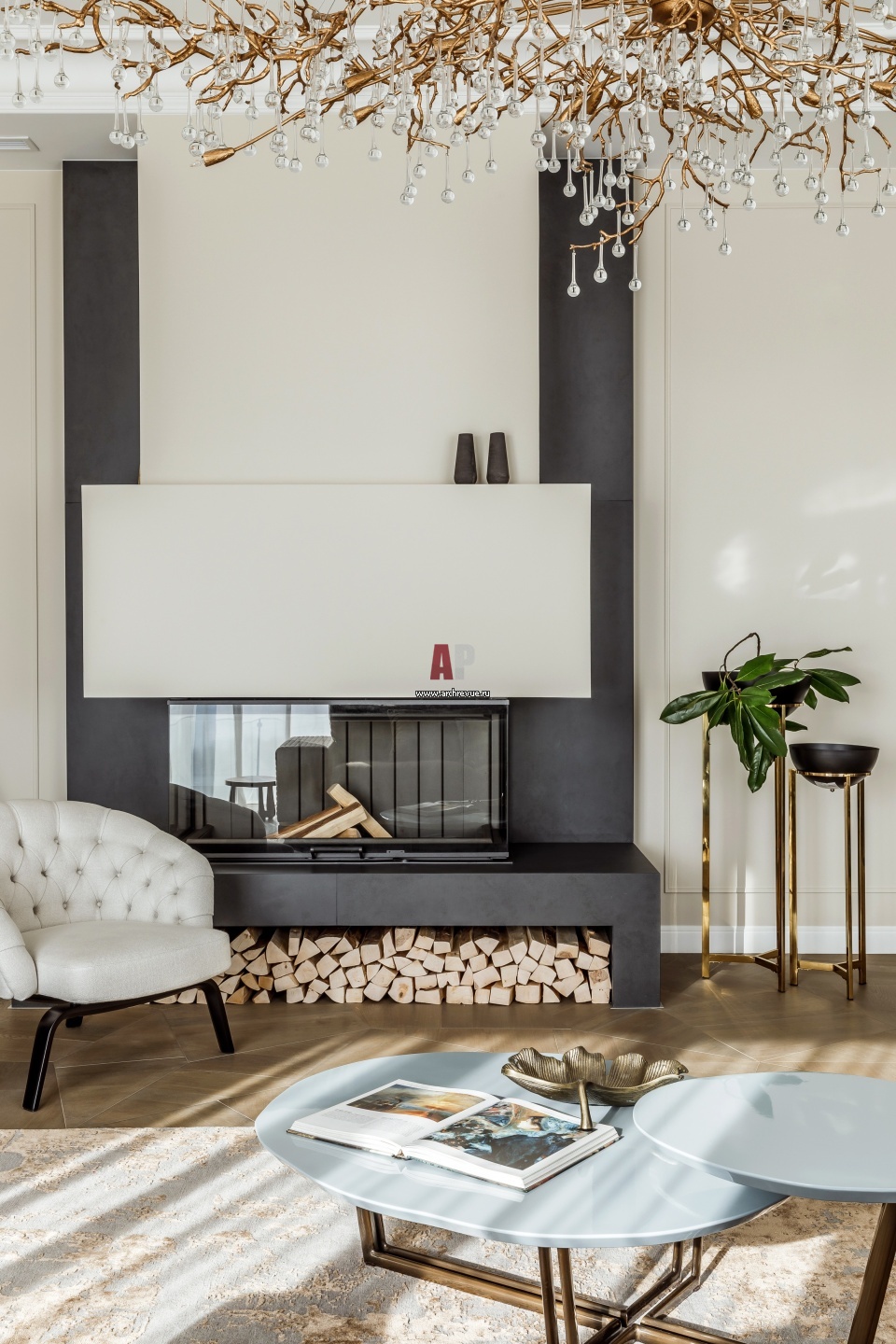 Современный дом с элементами ар-деко в Сочи. Каминная зона в гостиной.