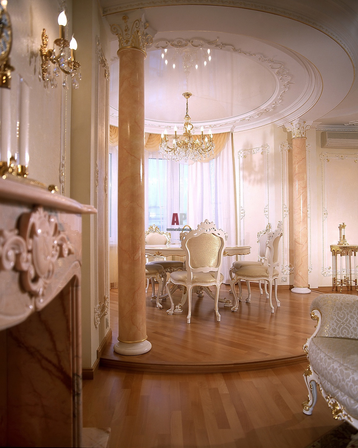 Столовая группа находится в полукруглом эркере на подиуме. Круглый стол подчеркнут круговым декором потолка.