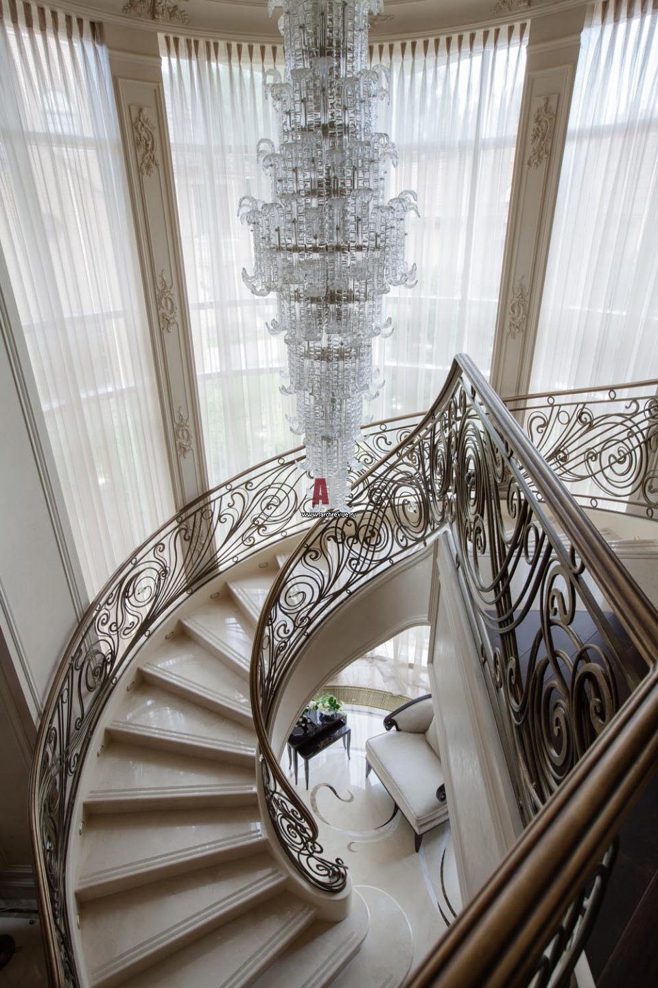 Центральная вертикаль дома – лестница-спираль с ажурным латунным ограждением, сделанным вручную специально для этого интерьера, и ступенями из белого камня.