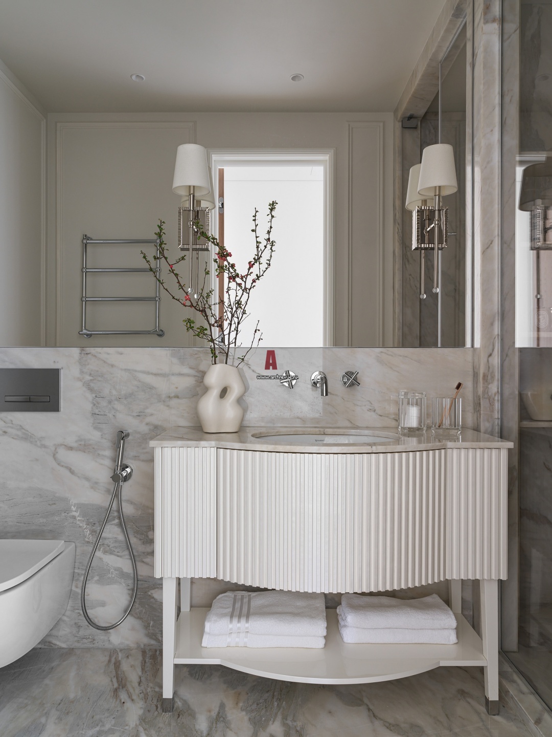 Женский санузел оформлен в светлой гамме. Пол и стены облицованы мрамором. Умывальник изготовлен на заказ. Сантехника, Duravit.