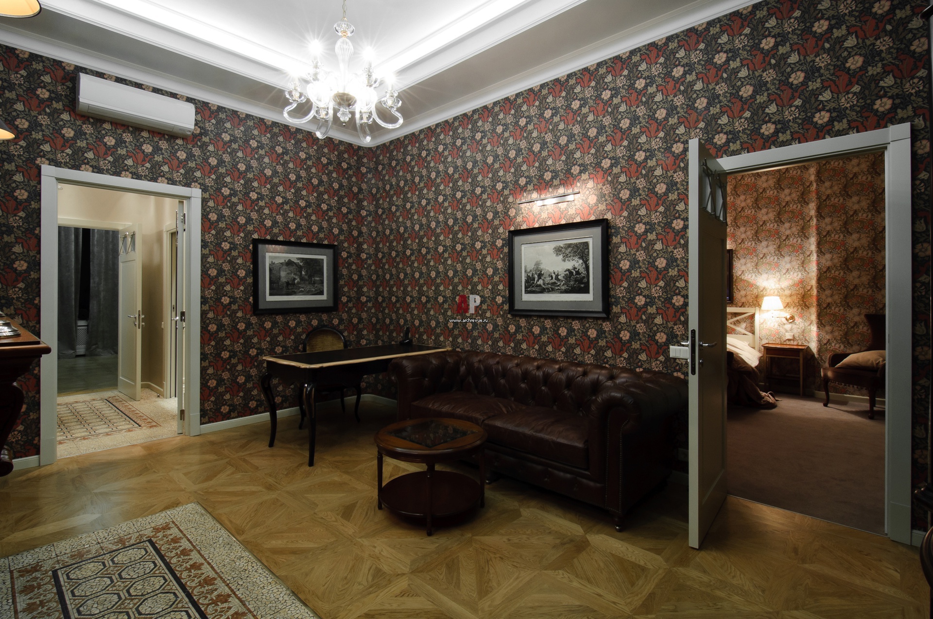 Кабинет в английском стиле. Стены оклеены английскими обоями с орнаментом в красно-зеленой цветовой гамме. Паркет из древесины среднеевропейского дуба, который имеет теплый, медово-янтарный оттенок, производитель Berti Pavimenti Legno.