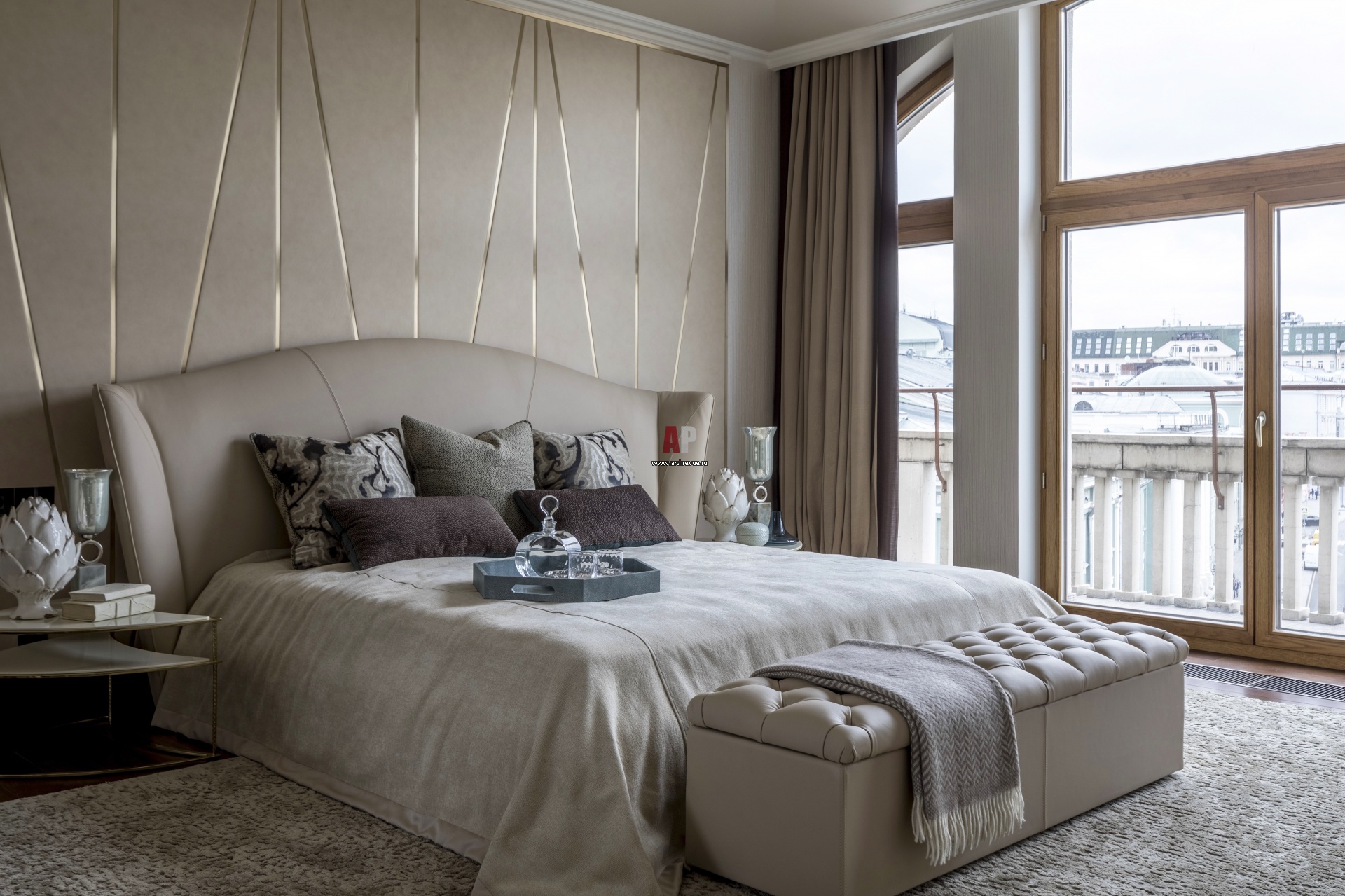 Гостевая спальня выполнена в светлой палитре. Кровать, Longhi. Стена за изголовьем кровати обита треугольными панелями из кожи со вставками из латуни. Плед, декор, аксессуары, поставщик, Charles.Cameron.