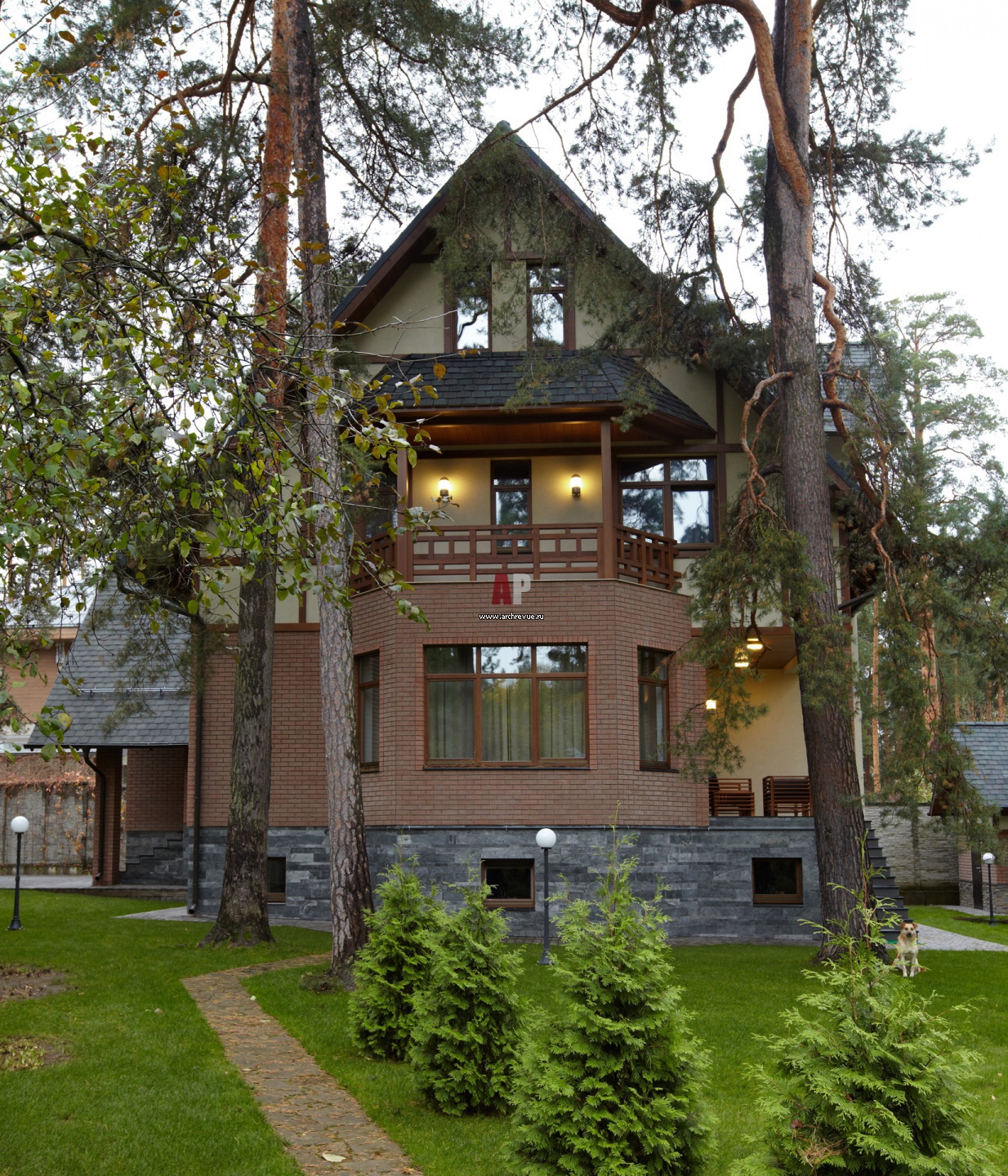 Фото главного фасада трехэтажного дома с мансардой. В основе дома – типовой проект с достроенной мансардой, эркером и открытым балконом на втором этаже.