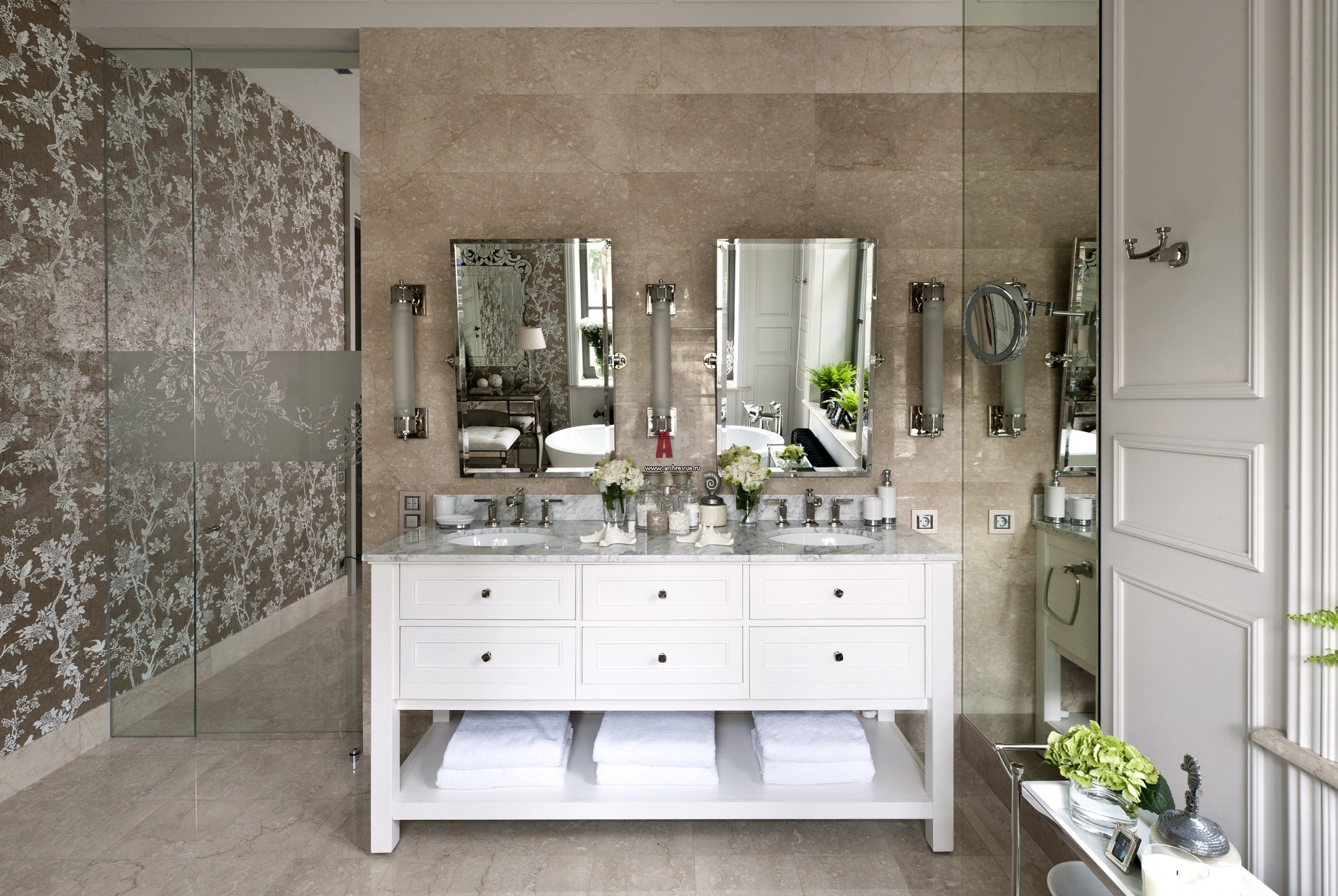 Интерьер ванной комнаты при хозяйской спальне выполнен в американском стиле. На полу и стенах – бежевый травертин. Зона санузла отделена от умывальника стеклянной перегородкой.