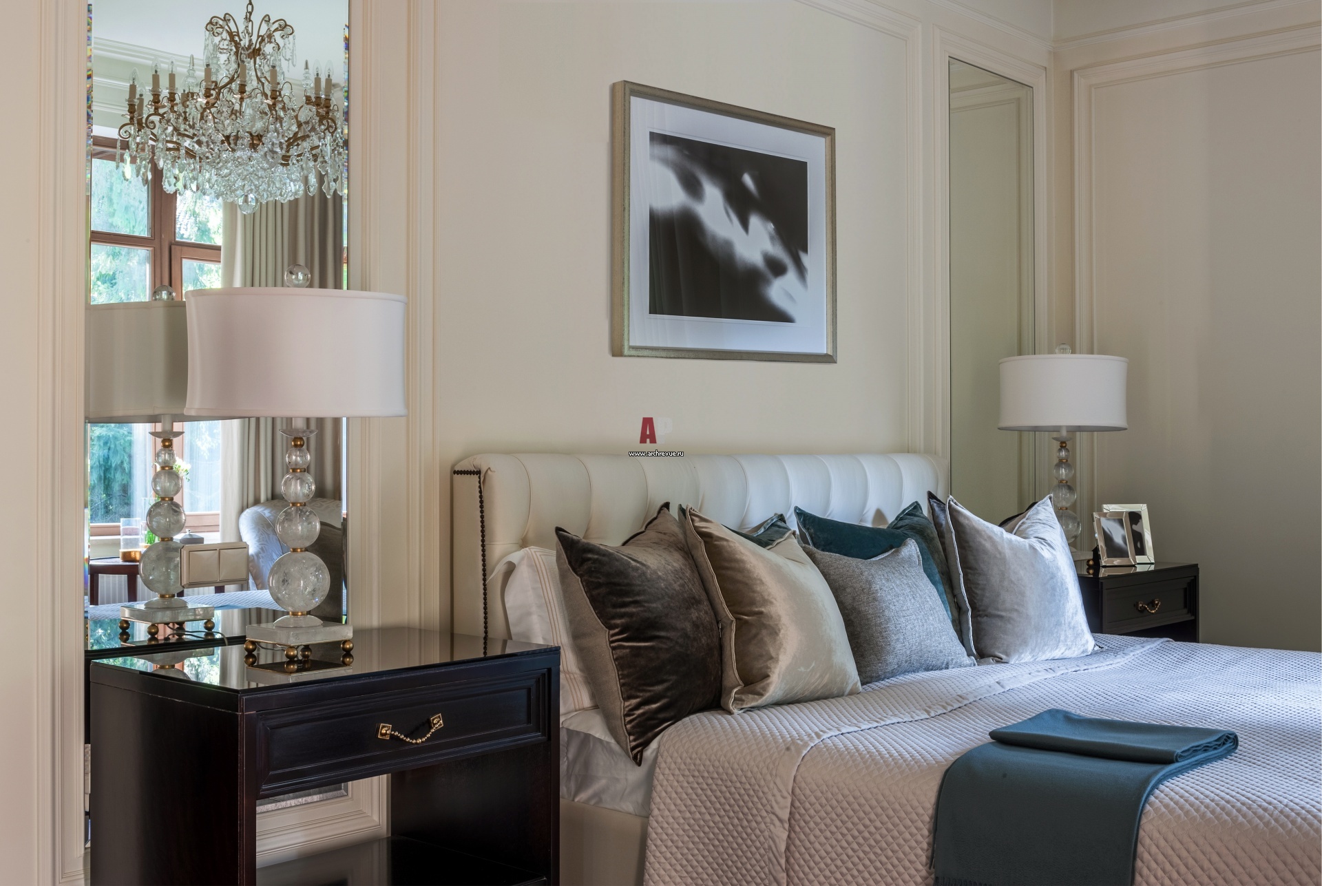 Дом в посёлке на Рублево-Успенском шоссе. Интерьер хозяйской спальни в серо-бежевых тонах. Люстра, настольная лампа, Schonbek.