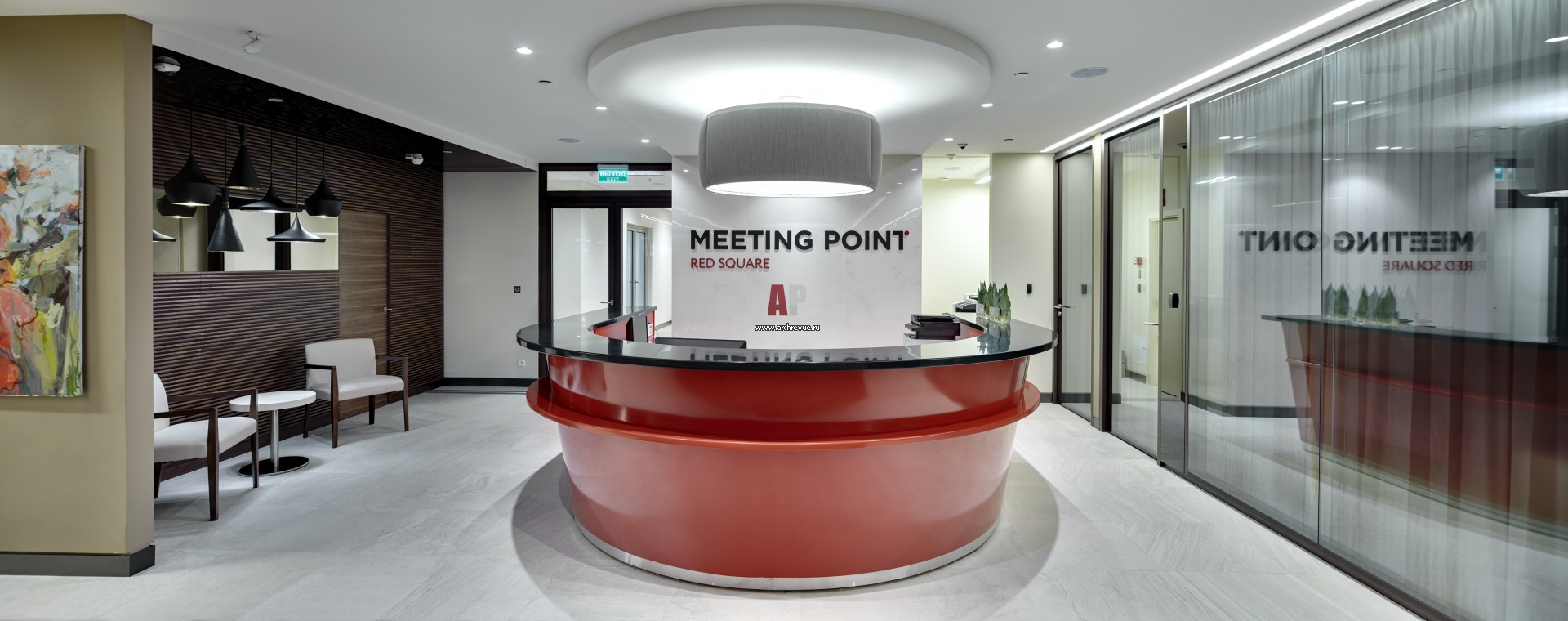 Интерьер входной зоны с рецепцией. Запоминающаяся красная стойка рецепции является «точкой отсчета», после которой начинается предельно рабочее пространство.