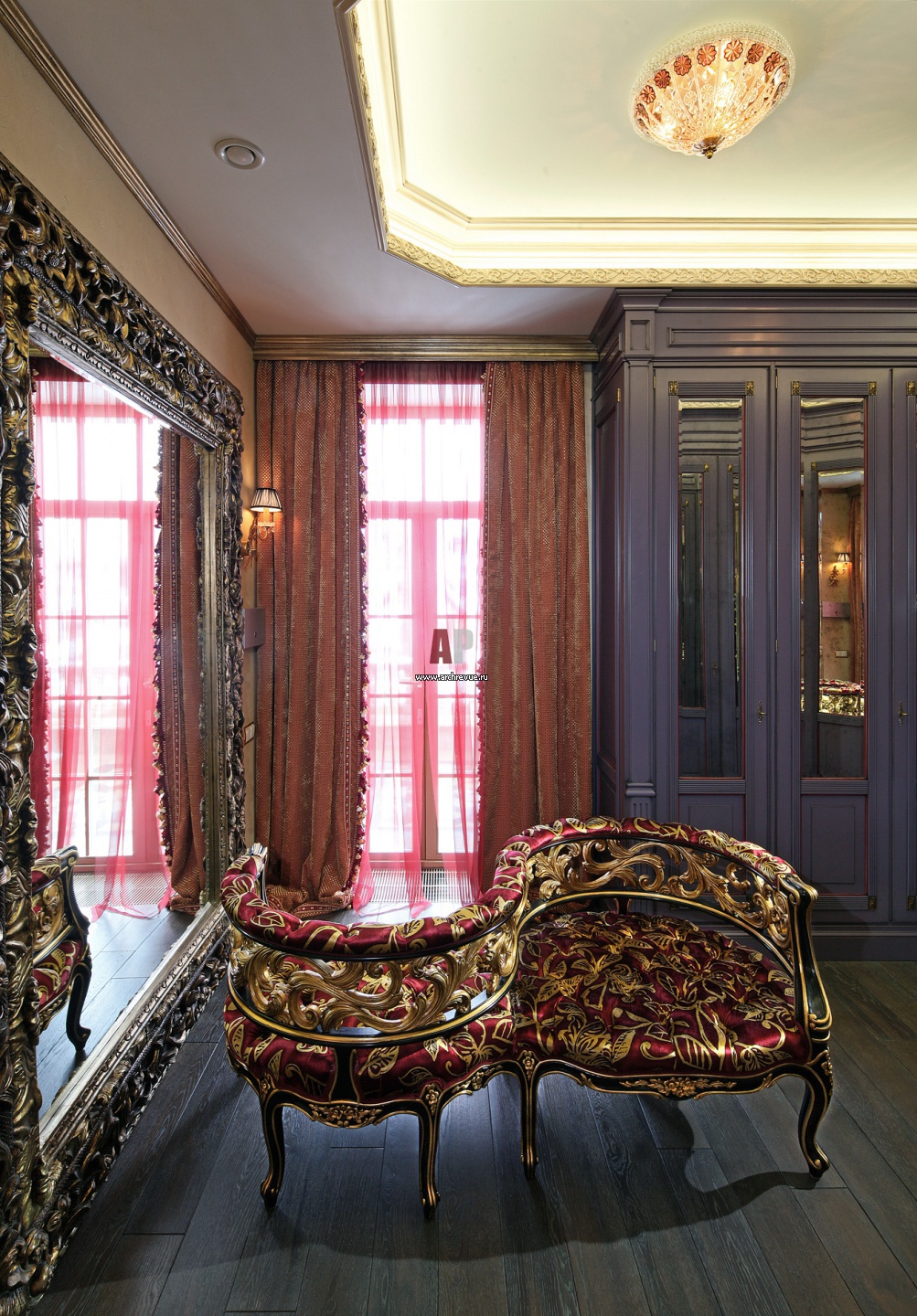 Гардеробная является частью приватных апартаментов, она исполнена в общей парадной барочной стилистике. Барочное кресло тет-а-тет.