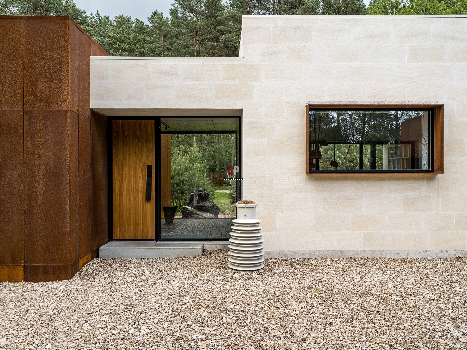 Архитектура дома – композиция из трех объемов-«кубиков», где правый блок занимает гостиная-кухня, левый – три маленькие спальни, а центральную часть – стеклянная прихожая.