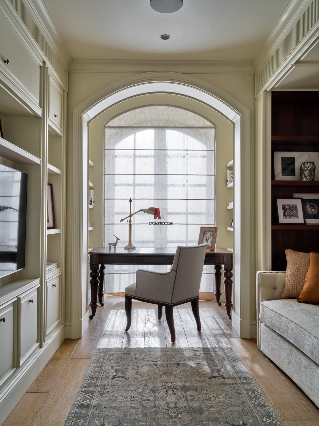 Дом в стиле американской классики для семьи с тремя детьми. Интерьер одной из спален с рабочей зоной в эркере.