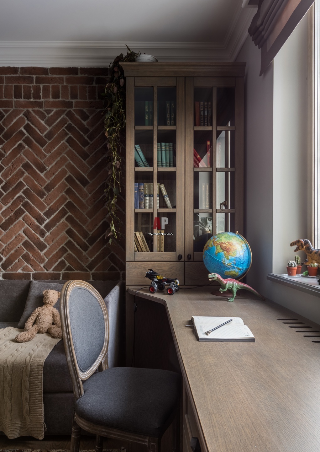 Письменный стол «на двоих» примыкает к окну. Мебель сделана на заказ из дуба с теплой фактурой.
