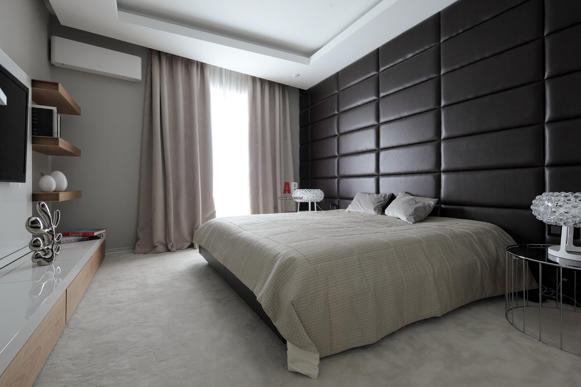 Интерьер спальни в шоколадных тонах. Кровать и высокое изголовье, задекорированное кожаными панелями, выполнены на заказ по эскизам архитекторов. Светильники, Foscarini. Стеллаж под ТВ, Mobileffe.