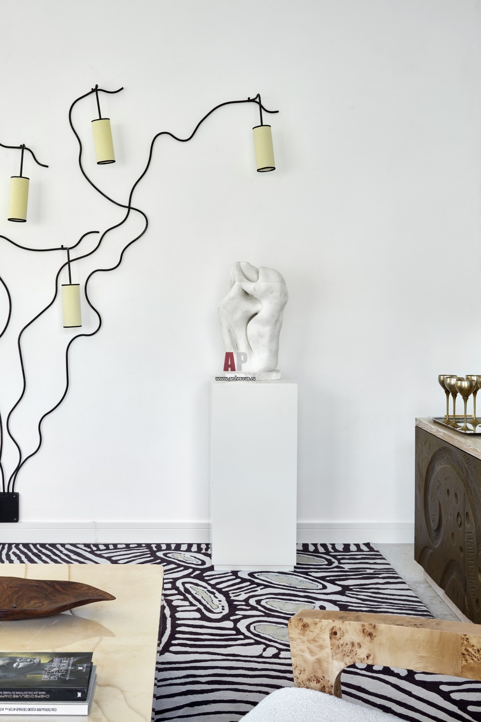 Стены первого этажа оформлены гипсовой штукатуркой белого цвета. Справа – фасад тумбы под ТВ выполнен с применением жидкого металла.