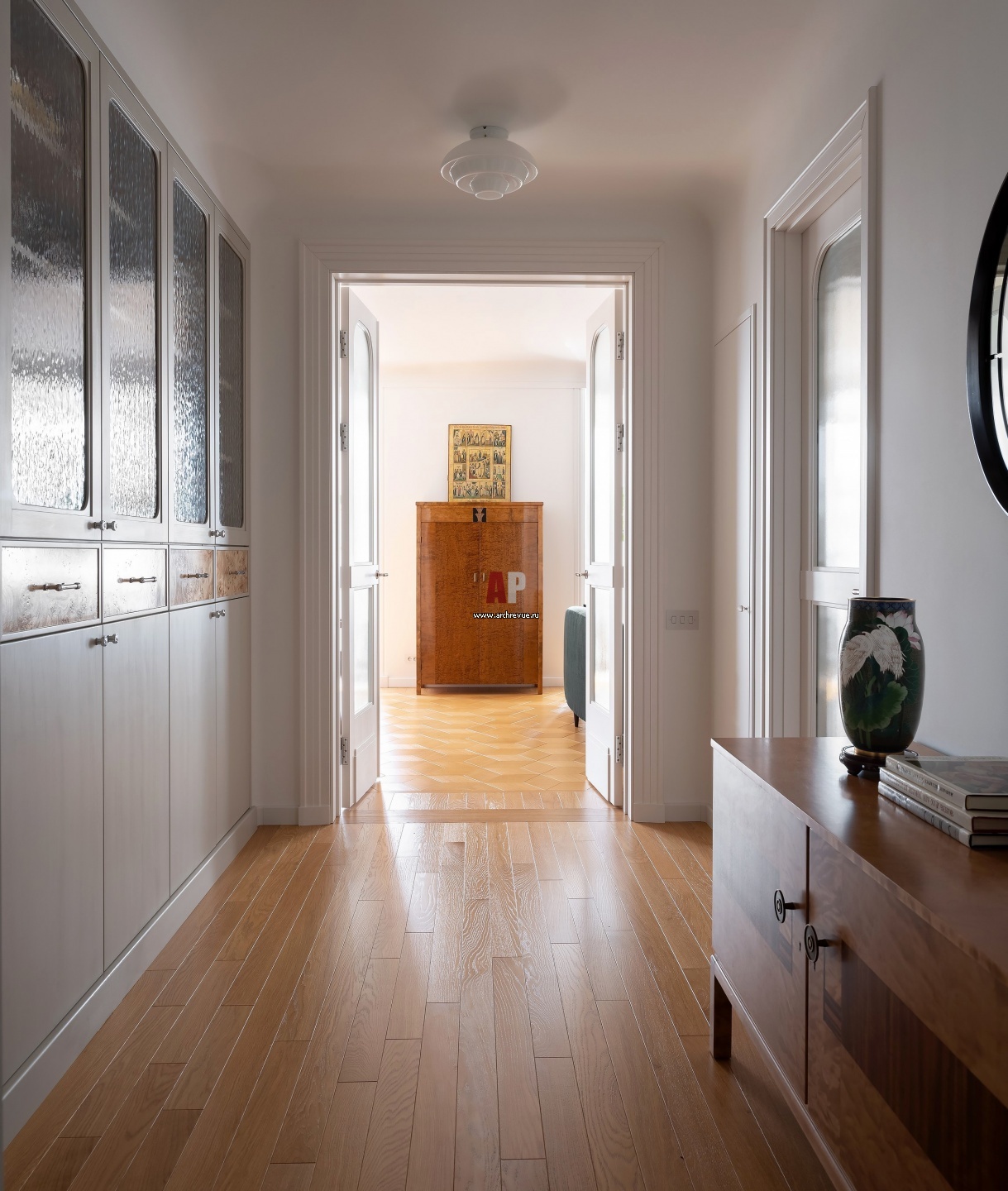 Коридор-галерея с библиотекой. Витрины и библиотечные шкафы изготовлены на заказ. Светильники, Zangra. Комод, Швеция, 1930-е гг. Вазы, эмаль клуазоне, Китай.