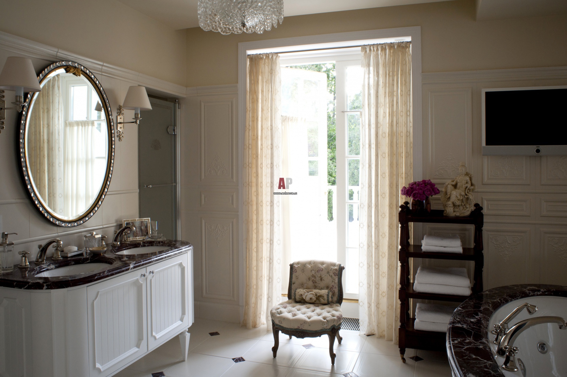Дизайн интерьера ванной комнаты с французским окном.