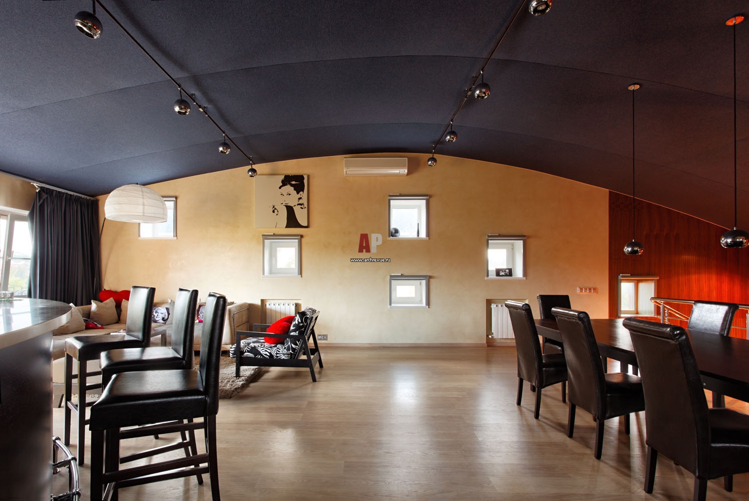 Фрагмент интерьера зоны отдыха в гостевом доме. Круглый потолок архитектор подчеркнула темной тканью. За ней смонтированы акустические панели.