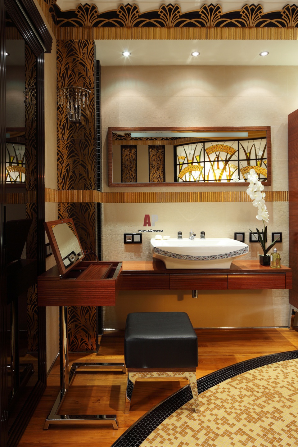 Интересный фактурный эффект дает облицовка пола мозаикой и тиковой доской. Сантехника, мебель, Villeroy & Boch.