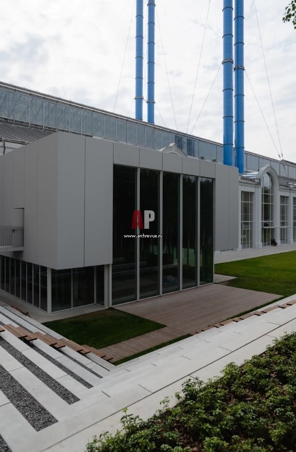 Со стороны двора к зданию был пристроен единственный дополнительный объем – актовый зал с пространством-трансформером на 420 мест, стеклянной стеной с видом на ландшафт и великолепной акустикой.