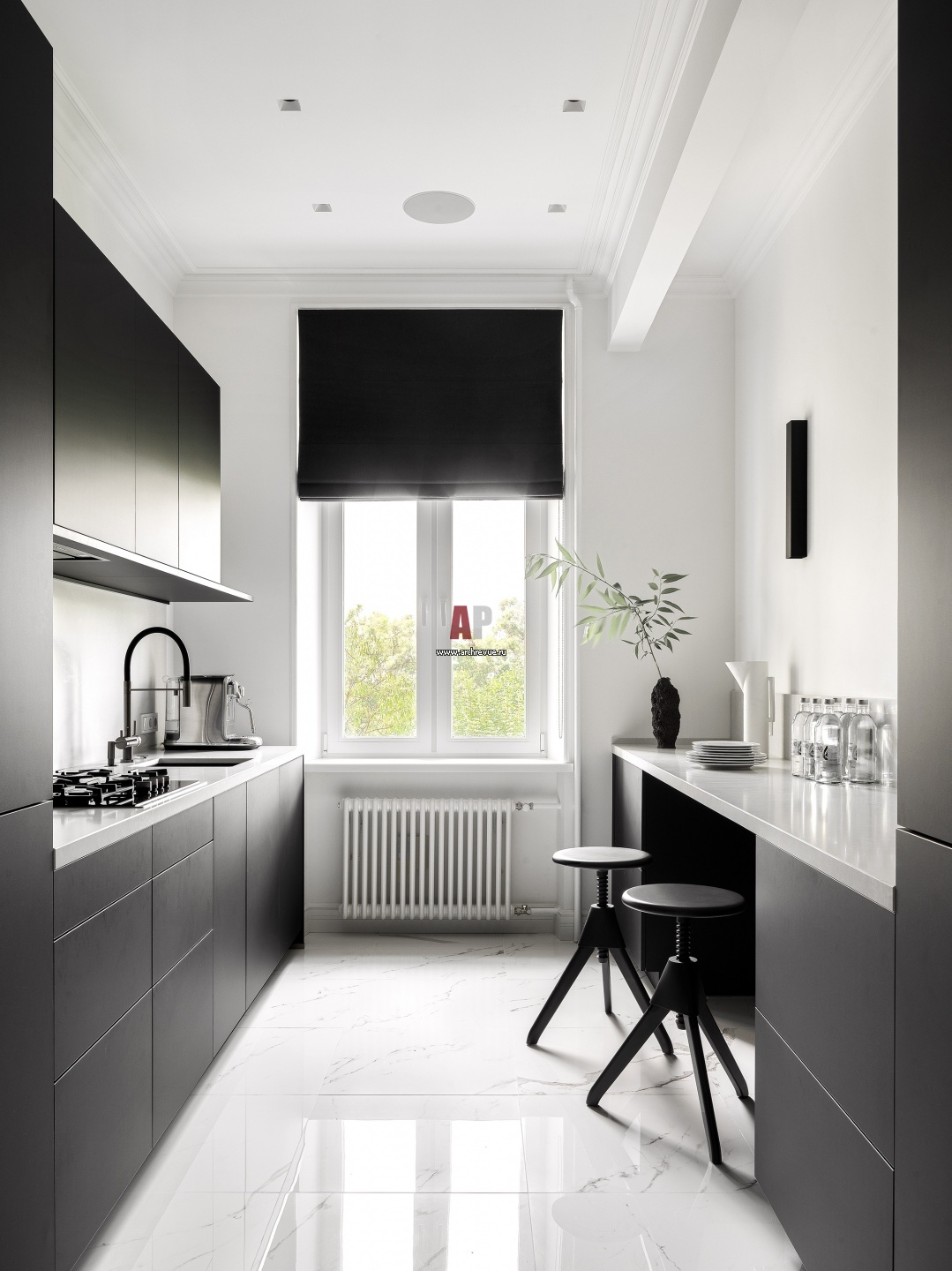 Кухня оформлена в тотальном монохроме. Черный кухонный гарнитур, Bauformat. Табуреты, Magis, модель Tom & Jerry. Шторы, Houles.