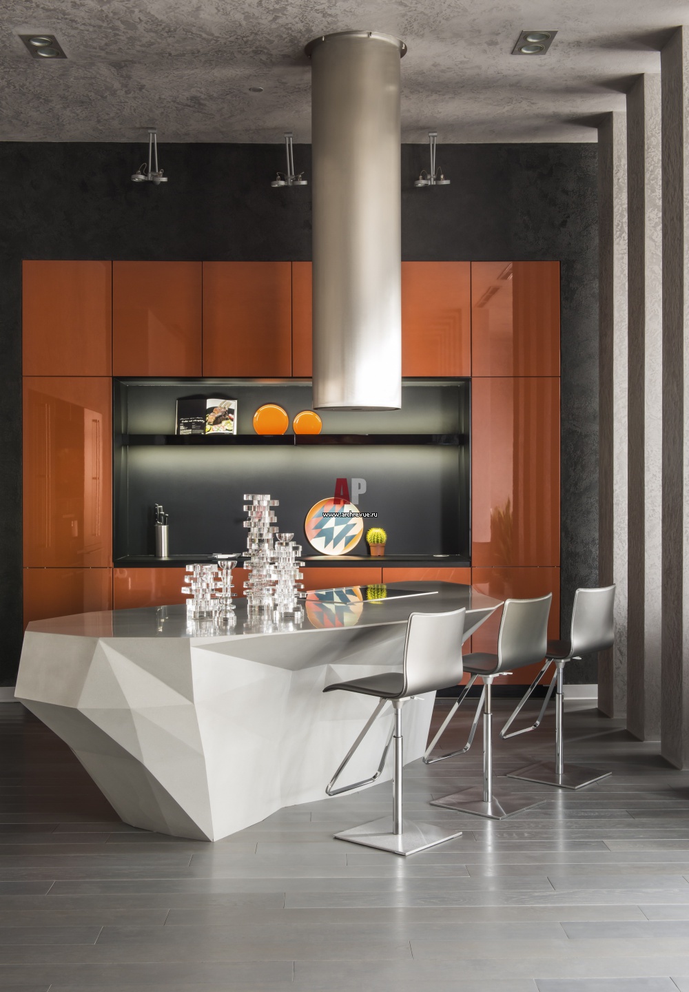 Оранжевая кухня Poggenpohl с островом в виде каменной глыбы. Он сделан из фанеры на металлическом каркасе и облит корианом. Барный стул, Cattelan Italia. Металлическая вытяжка, Gutmann.