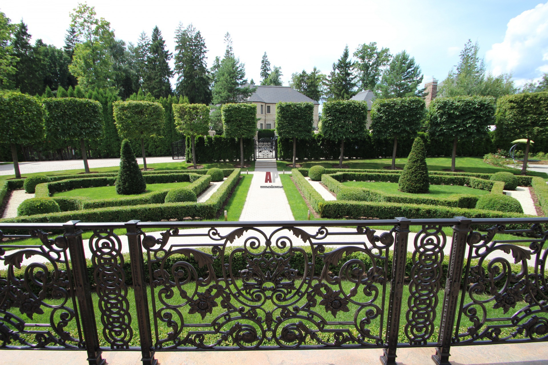 Вид со стороны крыльца и ажурного ограждения из литого металла на регулярный парк с партером из лип. Бордюры, шары, пирамиды – формованный самшит и тис. Отсыпка дорожек, мраморная крошка.