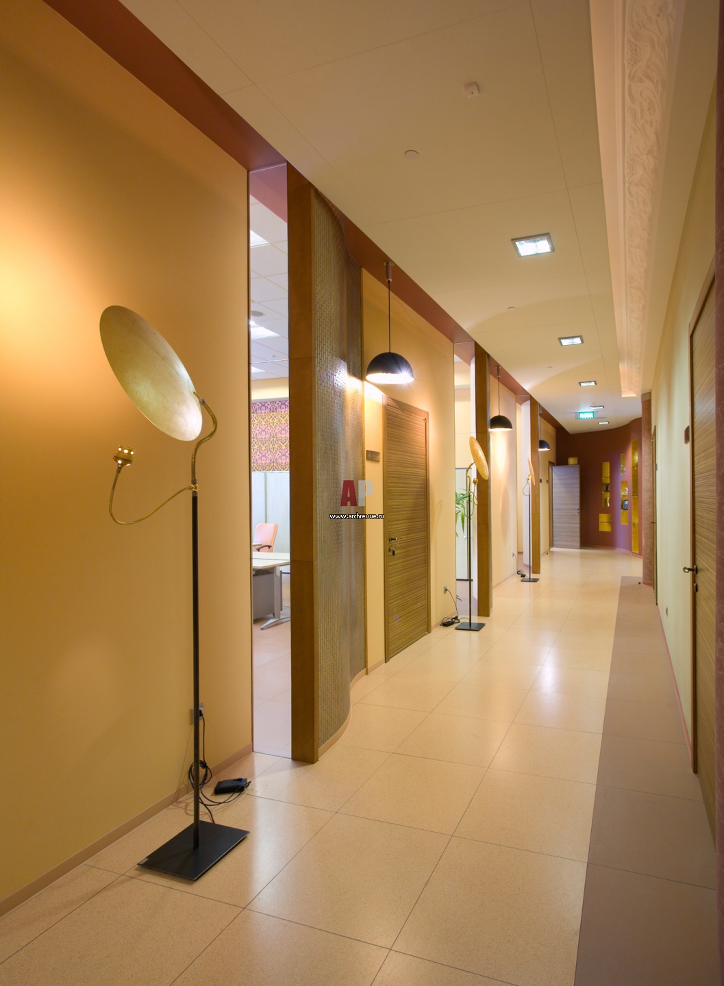 В коридоре с торцов конструктивных выступов смонтированы узкие и высокие стеклянные полотна. Сквозь них видна обстановка рабочих кабинетов.