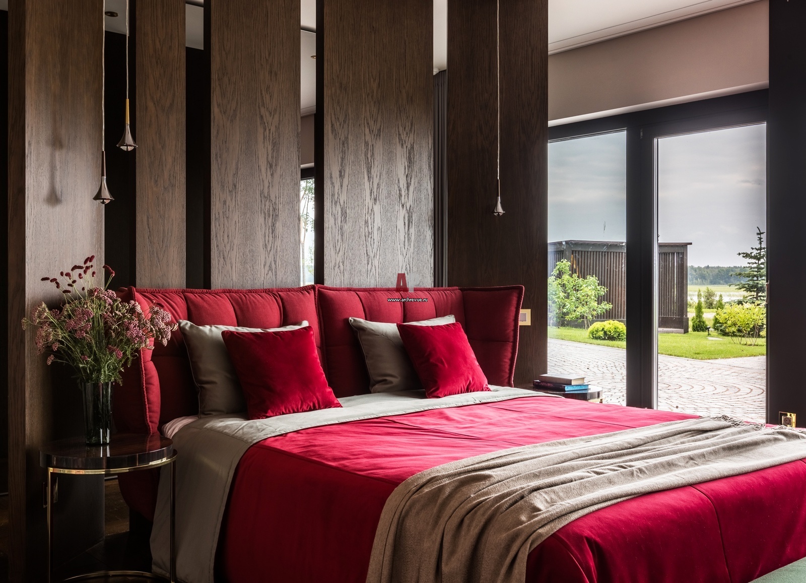 Дубовая перегородка за изголовьем кровати отделяет гардеробную. Кровать, кресло, B&B Italia. Банкетка, Flexform. Столики прикроватные, Pianca. Подвесы в изголовье, Studio Italia Design. Люстра и бра, Bover.