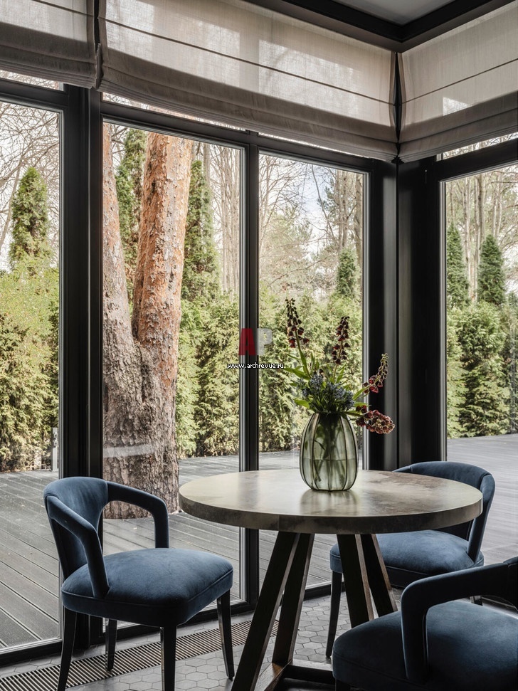 Столик для завтраков расположен возле панорамного окна в пристроенном объеме террасы.