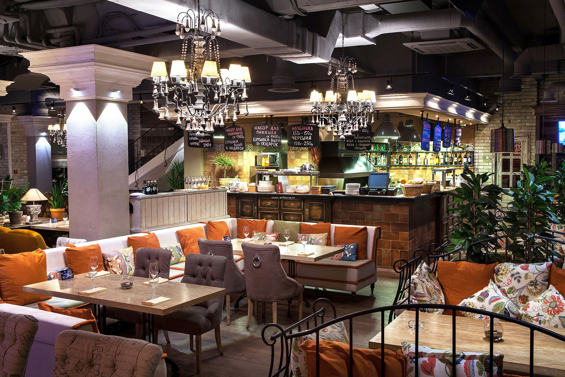 На фото – интерьер зала ресторана мясной кухни в лофте с домашней атмосферой. Фасад стойки открытой кухни оформлен деревянными панелями с эффектом старения. Дверь на заднем плане покупалась без покраски и искусственно старилась с помощью декоративных составов Sikkens (краски по дереву Rubbol, лаки Cetol), поставщик «Дом Краски / Деко – Эм».