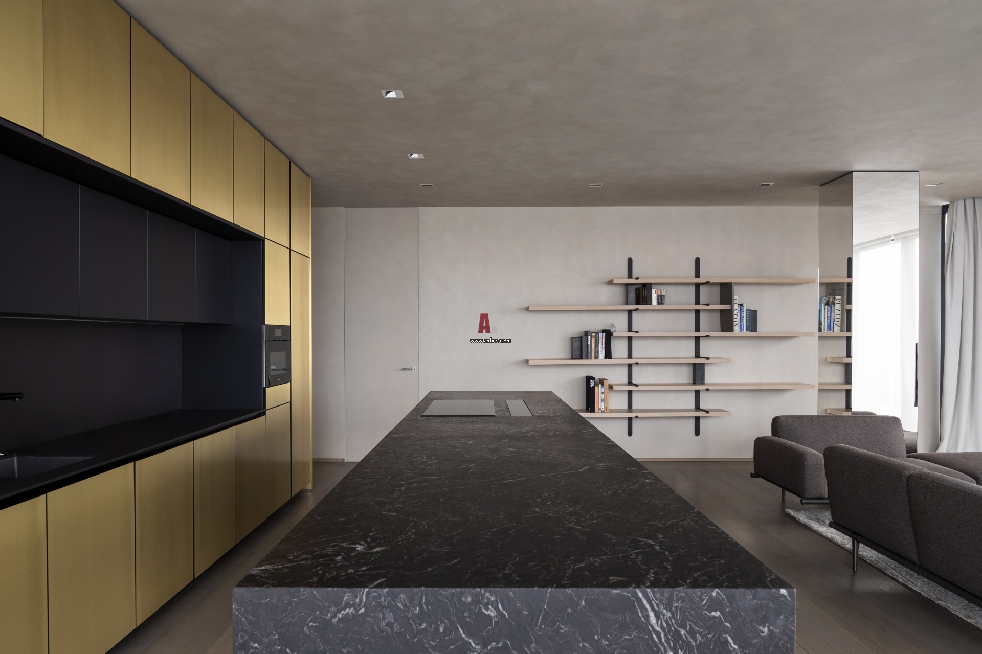 В гостиной, столовой и кухне основной акцент – объем, облицованный латунными панелями. На стенах – известковая краска с тактильным эффектом. Дверь-невидимка ведет в детский блок.