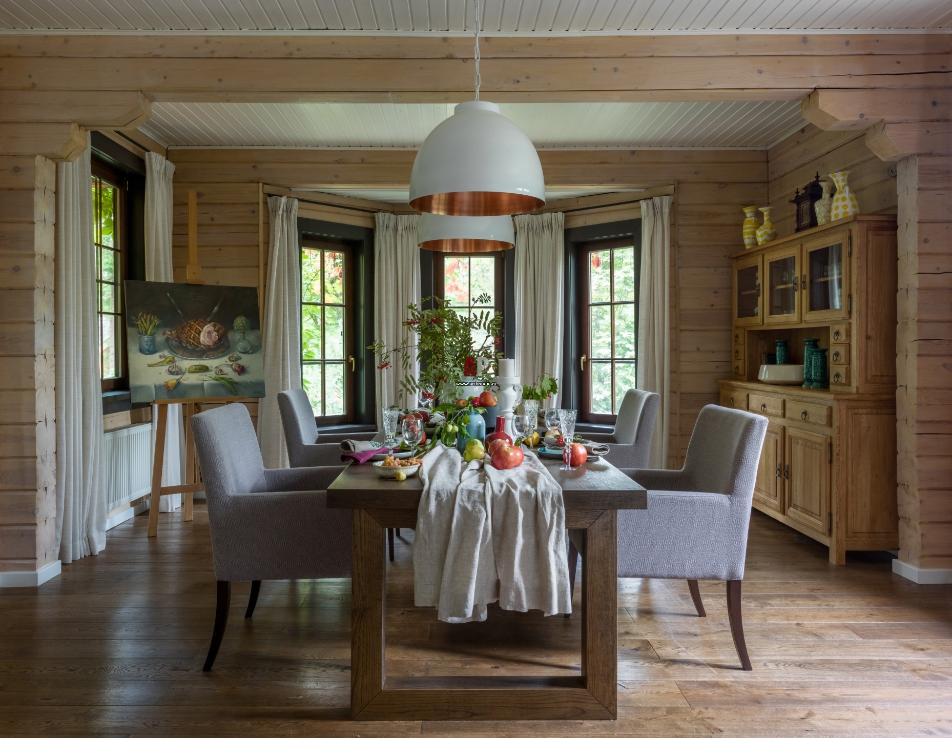 Деревянная дача для большой семьи. Интерьер парадной столовой. Обеденный стол на 12 персон сделан из массива дуба российскими мастерами под заказ.
