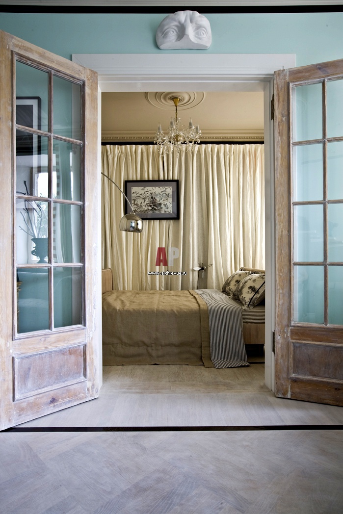 Двери в спальню – едва ли не главная гордость автора проекта. Они настоящие, антикварные, выполненные в стилистике сталинского ампира. С них сняли 7 слоев краски, обнажили истинную фактуру, затерли шпаклевкой, покрыли белым лаком и срифмовали с отделкой пола.