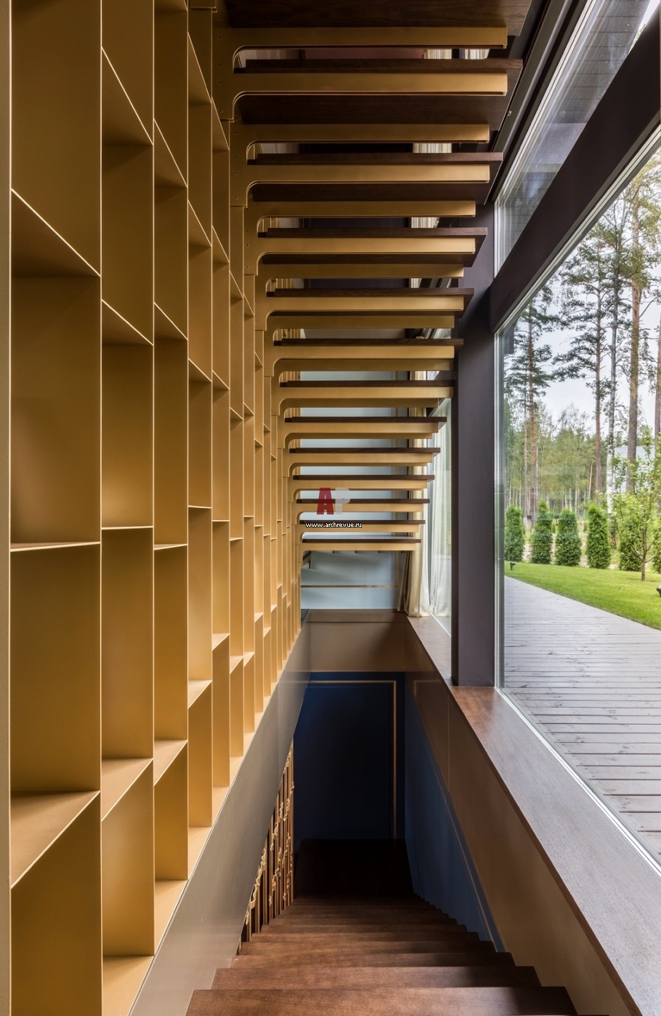 Лестница на три пролета имеет индивидуальную конструкцию креплений на каждом этаже. На первом этаже лестница шла на фоне стеклянной стены. Косоуры лишили бы интерьер воздуха, поэтому была разработана необычная конструкция – стеллаж для книг, боковины которого являются основанием для кронштейнов-ступеней. Лестница-стеллаж разработана петербургским художником по металлу Дмитрием Волковым. Полки выполнены из металла, окрашенного в бронзовый цвет, и работают на просвет.