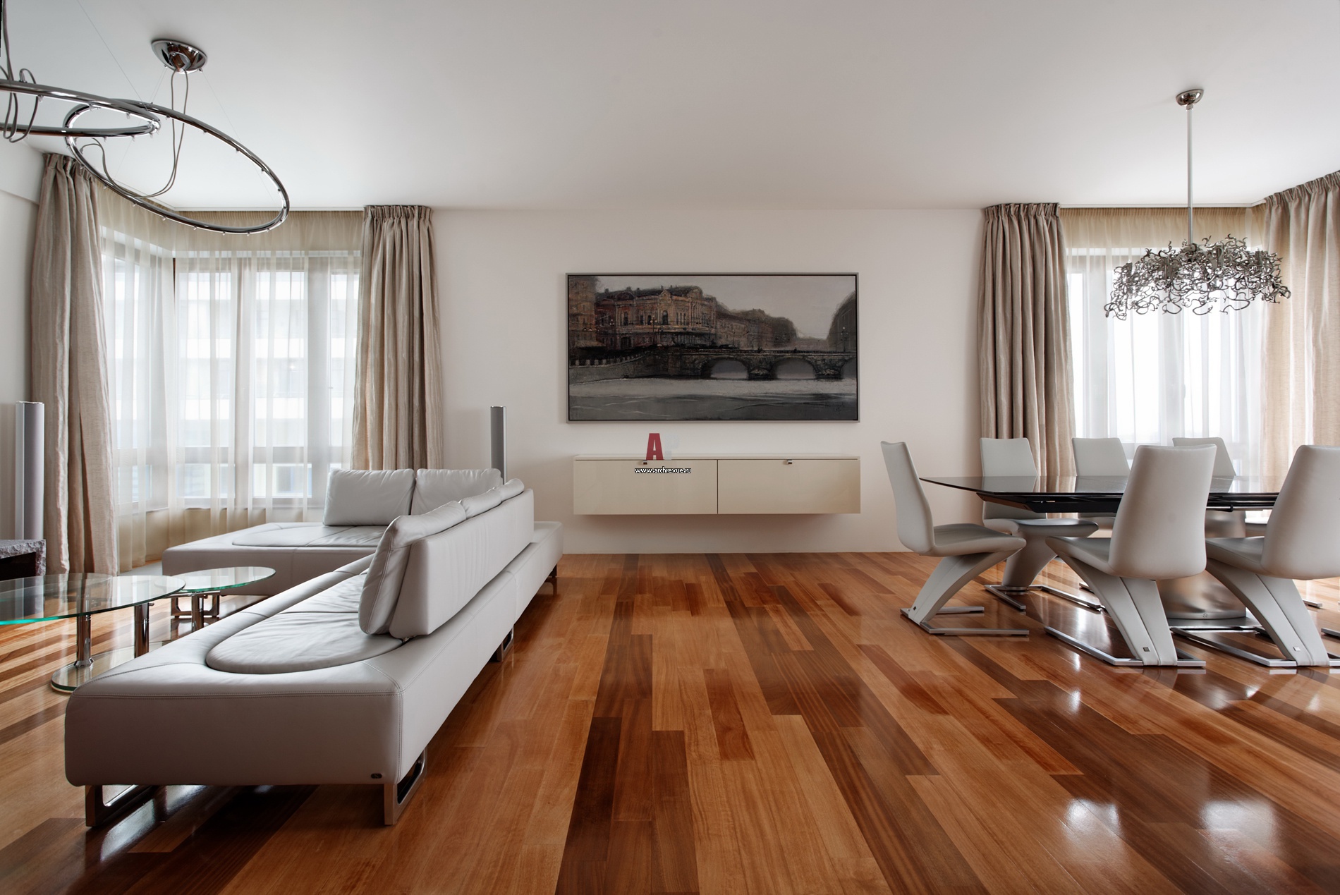 Специфическая особенность планировки гостиной – сдвинутые в углы окна. Чтобы пустая стена не давила, авторы декорировали ее живописным пейзажем. Художник Дмитрий Иконников писал картину специально под этот интерьер.