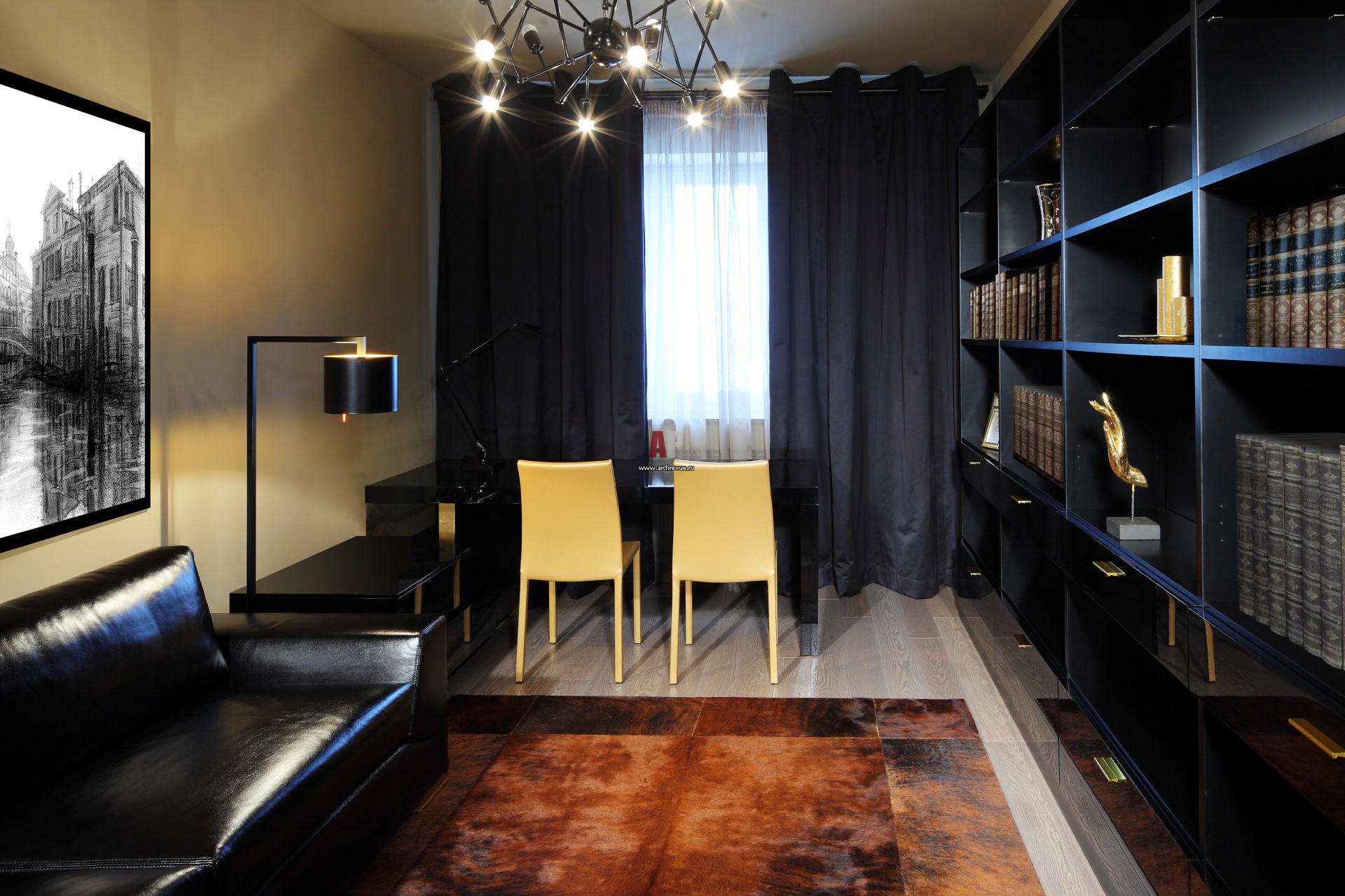 Интерьер кабинета в современном стиле. Диван, Danti. Стеллаж и стол, Besana. Светильник, Flos. На полу – дубовая инженерная доска и ковер из охристо-красной шкуры.