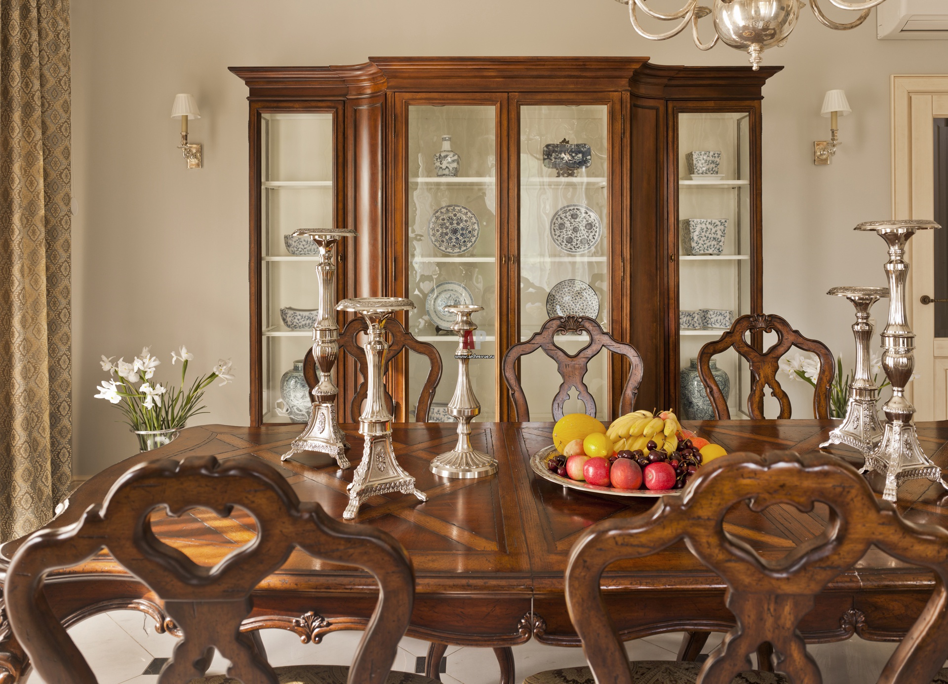 Столовая группа в американском доме. В застекленном шкафу-витрине выставлена коллекция китайской голубой керамики. Витрина, овальный обеденный стол, стулья, Henredon.
