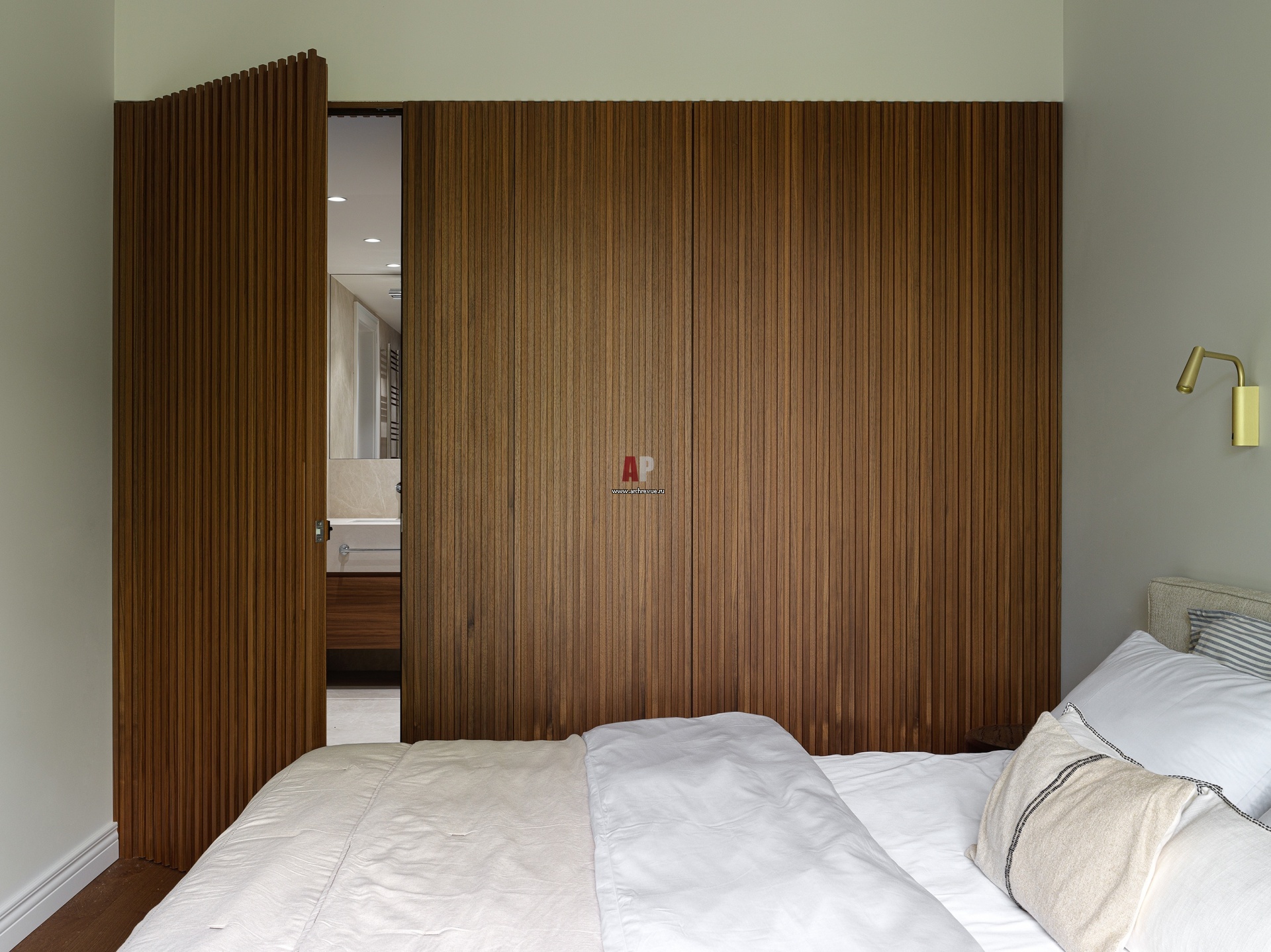 Одна стена в спальне зашита деревянными реечными фасадами. За ними скрыт встроенный шкаф и дверь в главную ванную комнату с проходной планировкой.
