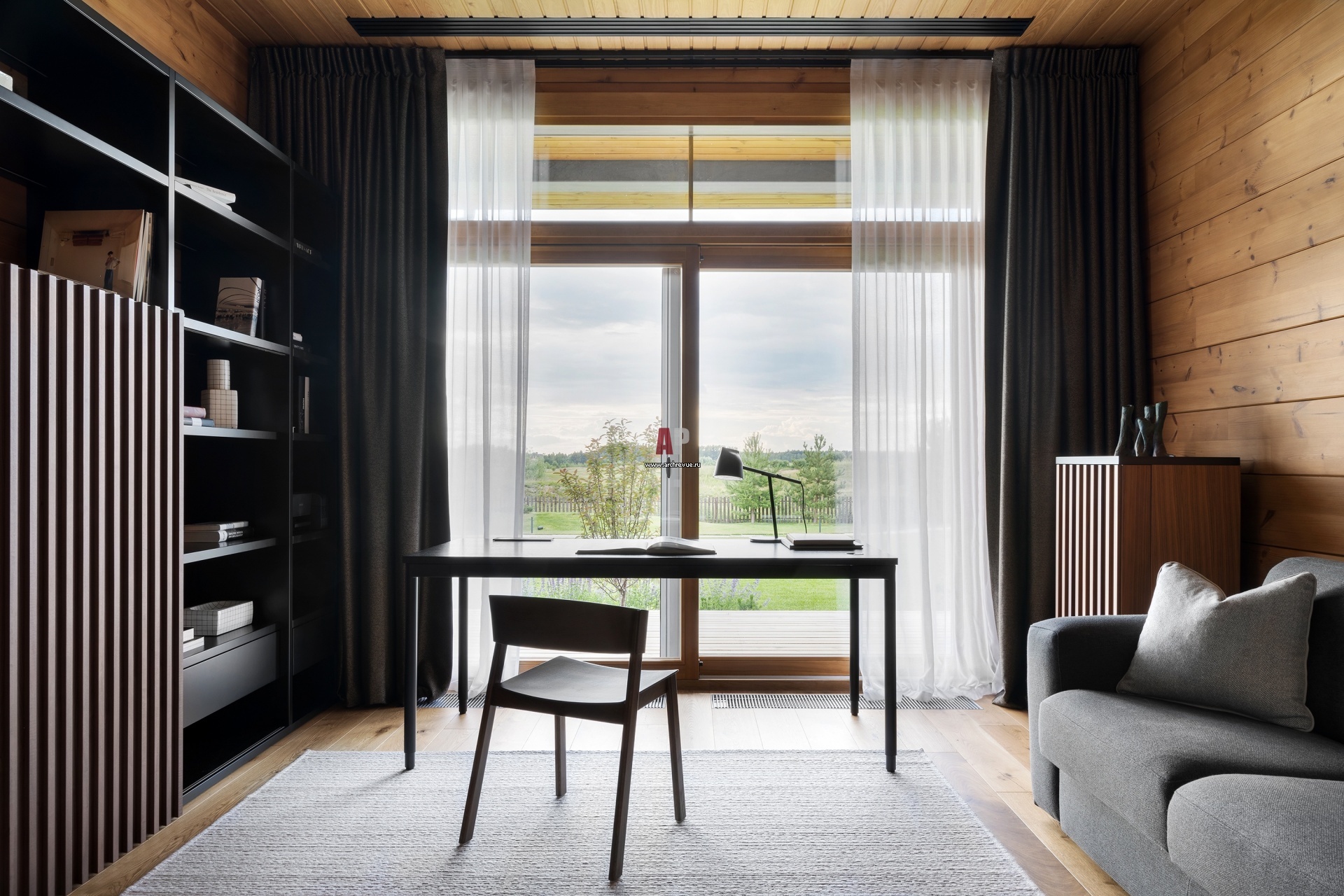 Деревянный дом для большой семьи. Кабинет с панорамным окном хозяина дома.