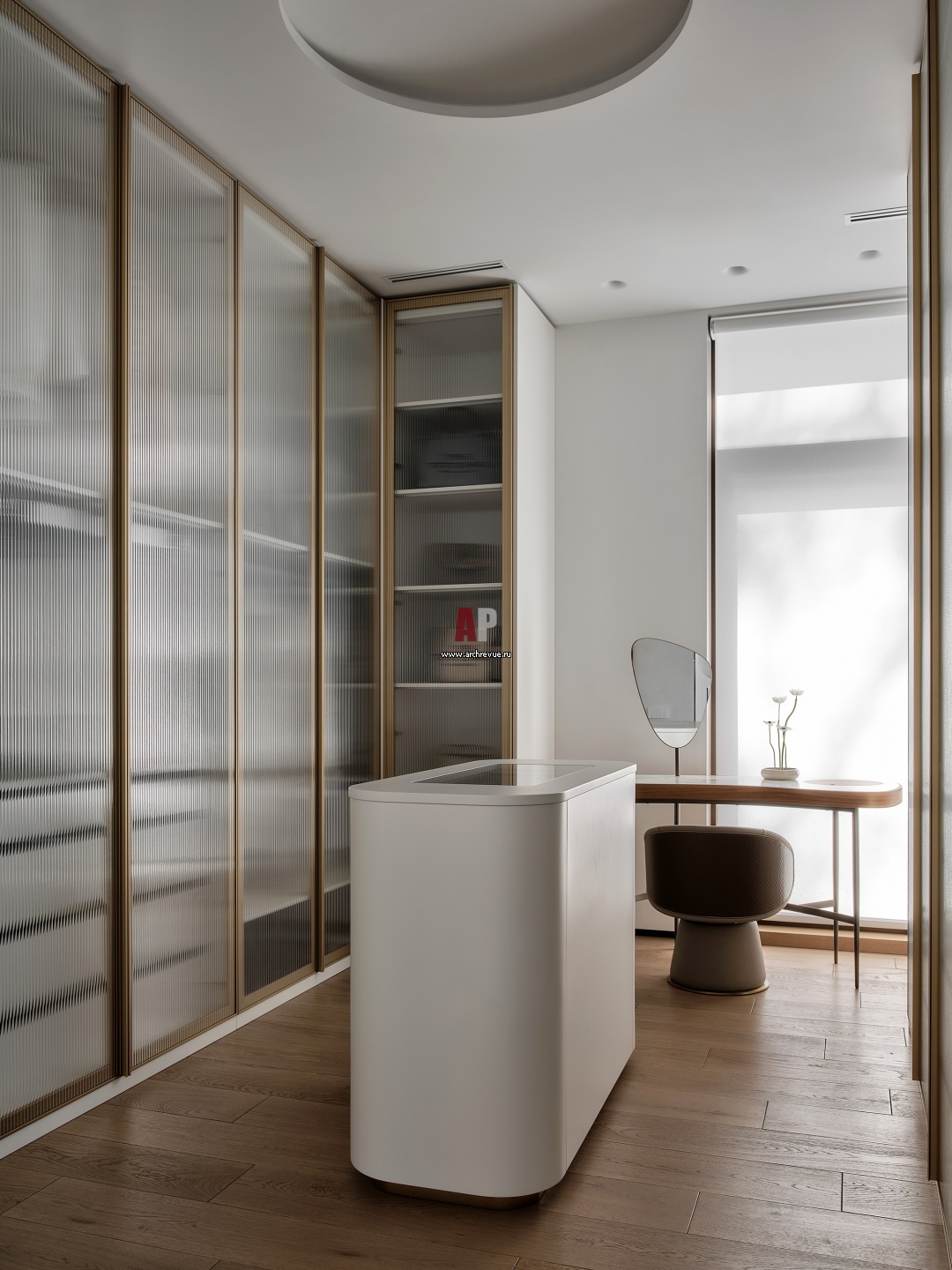 Гардеробная. Туалетный столик, Bonaldo, модель Venus. Шкаф с рифленым стеклом и золотым профилем сделан на заказ. В центре – небольшой остров для хранения аксессуаров.