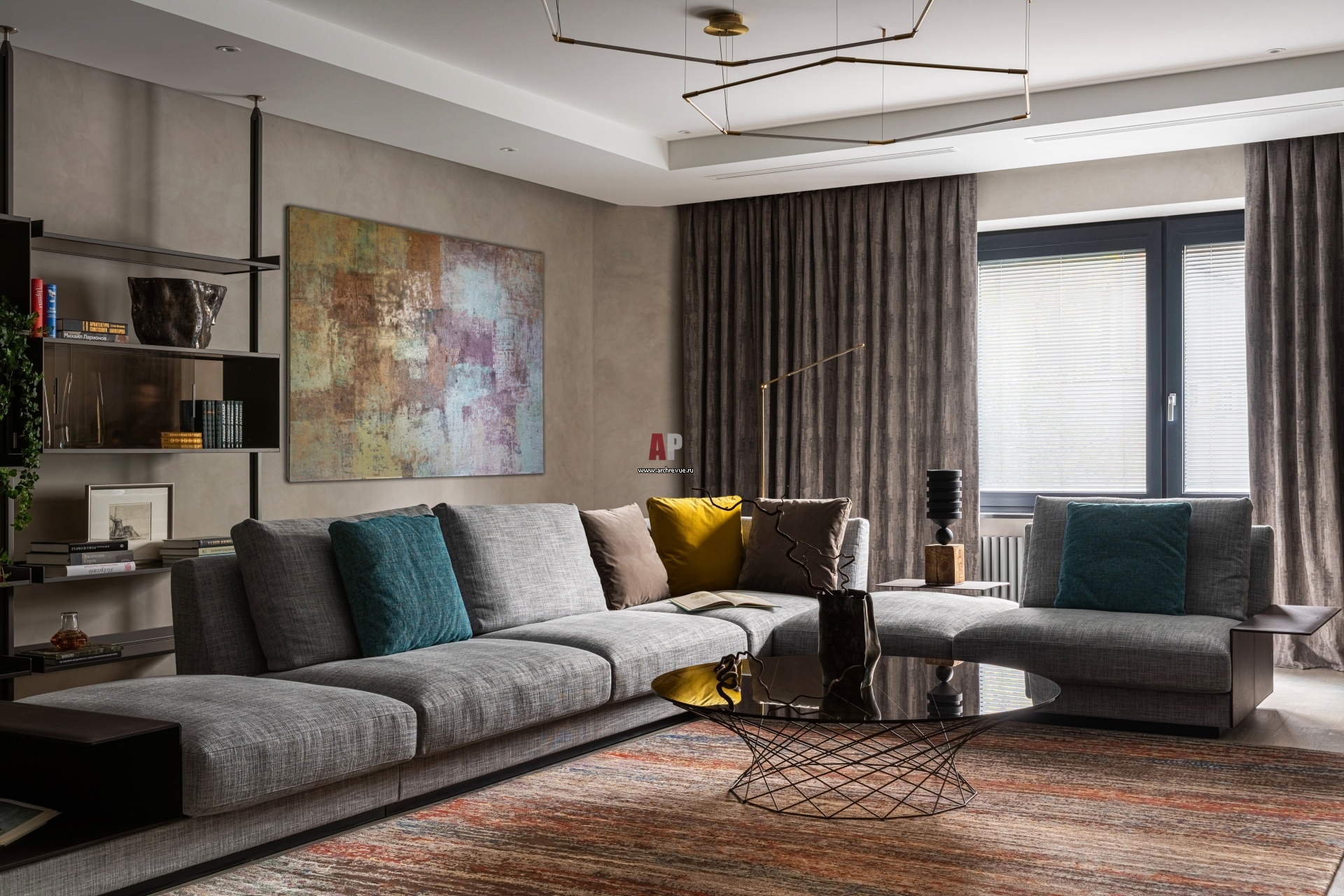 Спокойный интерьер квартиры для семьи с детьми. Диван, столик, ковер, Walter Knoll. Светильники, Juniper. Живопись, Ольга Шагина. Керамика, Светлана Левадная, Levadnaja Decor. Деревянная скульптура, Злата Корнилова.