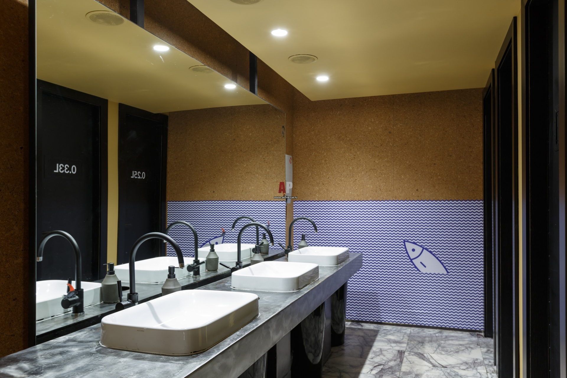 Дизайн туалетной комнаты ресторана с рыбной кухней.