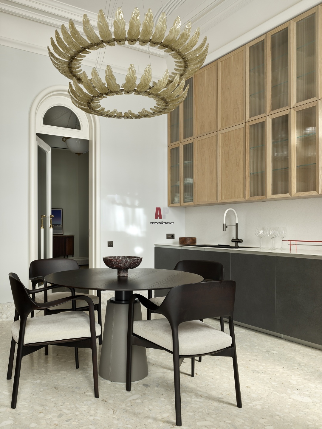 Кухня-столовая. Люстра, Italamp; Обеденный стол, Poltrona Frau. Стулья, Porada.