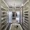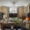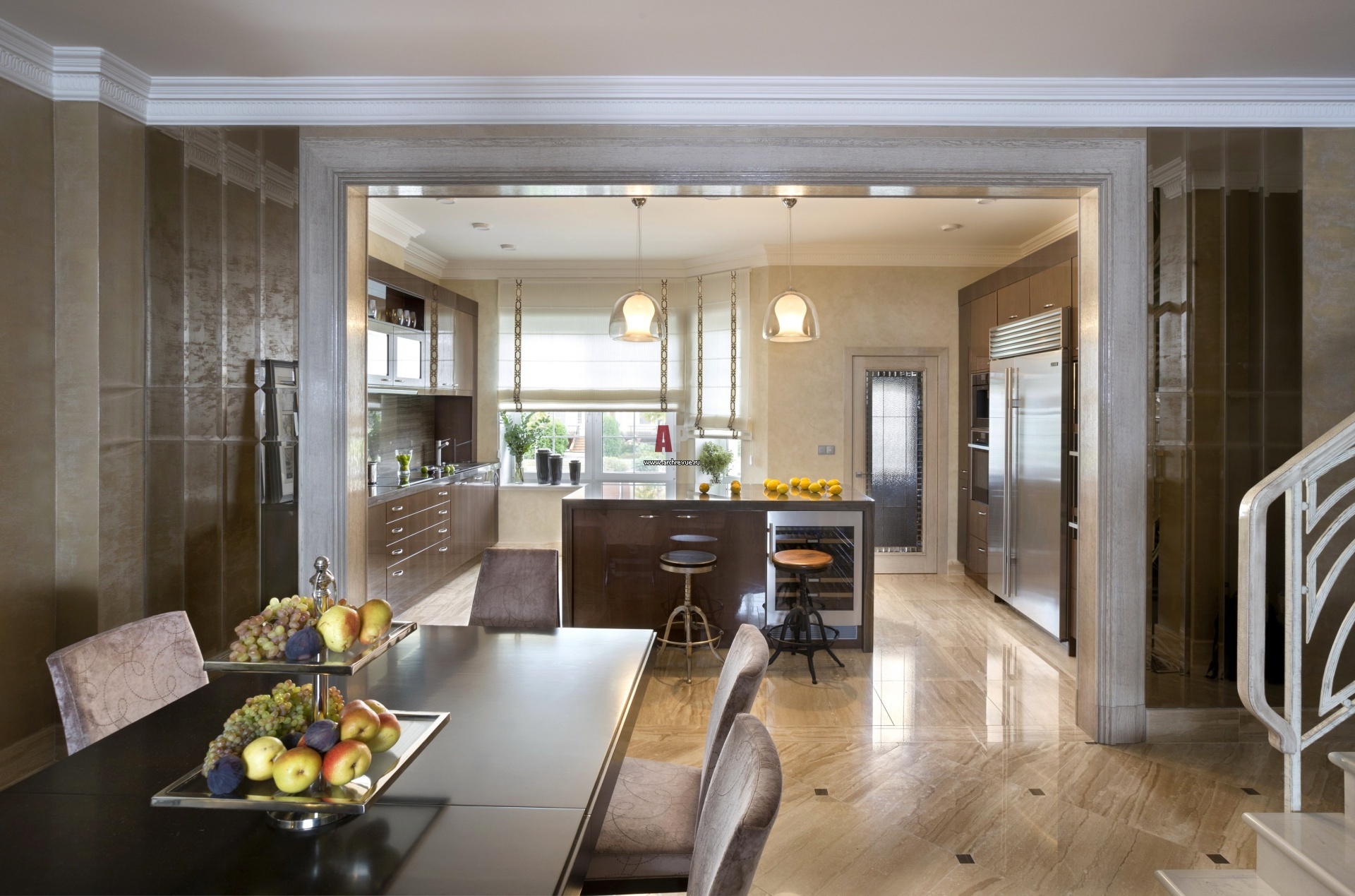 Открытый проем между кухней и гостиной оформлен порталом из дерева и вертикальными панелями из бронзового зеркала.