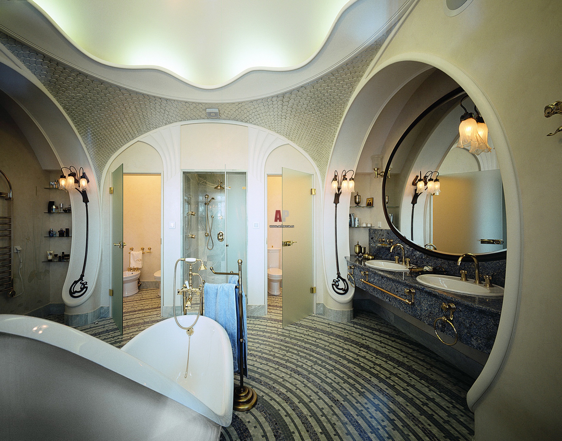 Ванна расположена в центре и напоминает жемчужину, вокруг которой расходятся водяные круги. Круги эти выложены мраморной мозаикой всех возможных оттенков воды, поставщик «Центральная мастерская гранитного и мраморного строительства».