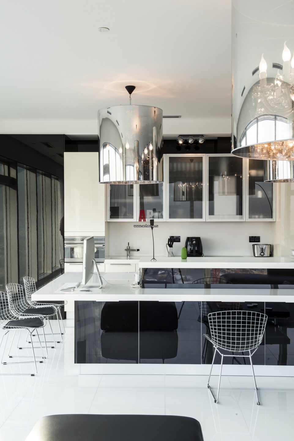 Интерьер кухни в стиле хай-тек. Фасады гарнитура белого цвета с блестящей поверхностью и вставками из стекла, Pedini. Светильники MOOOI, Fabbian, Flos.