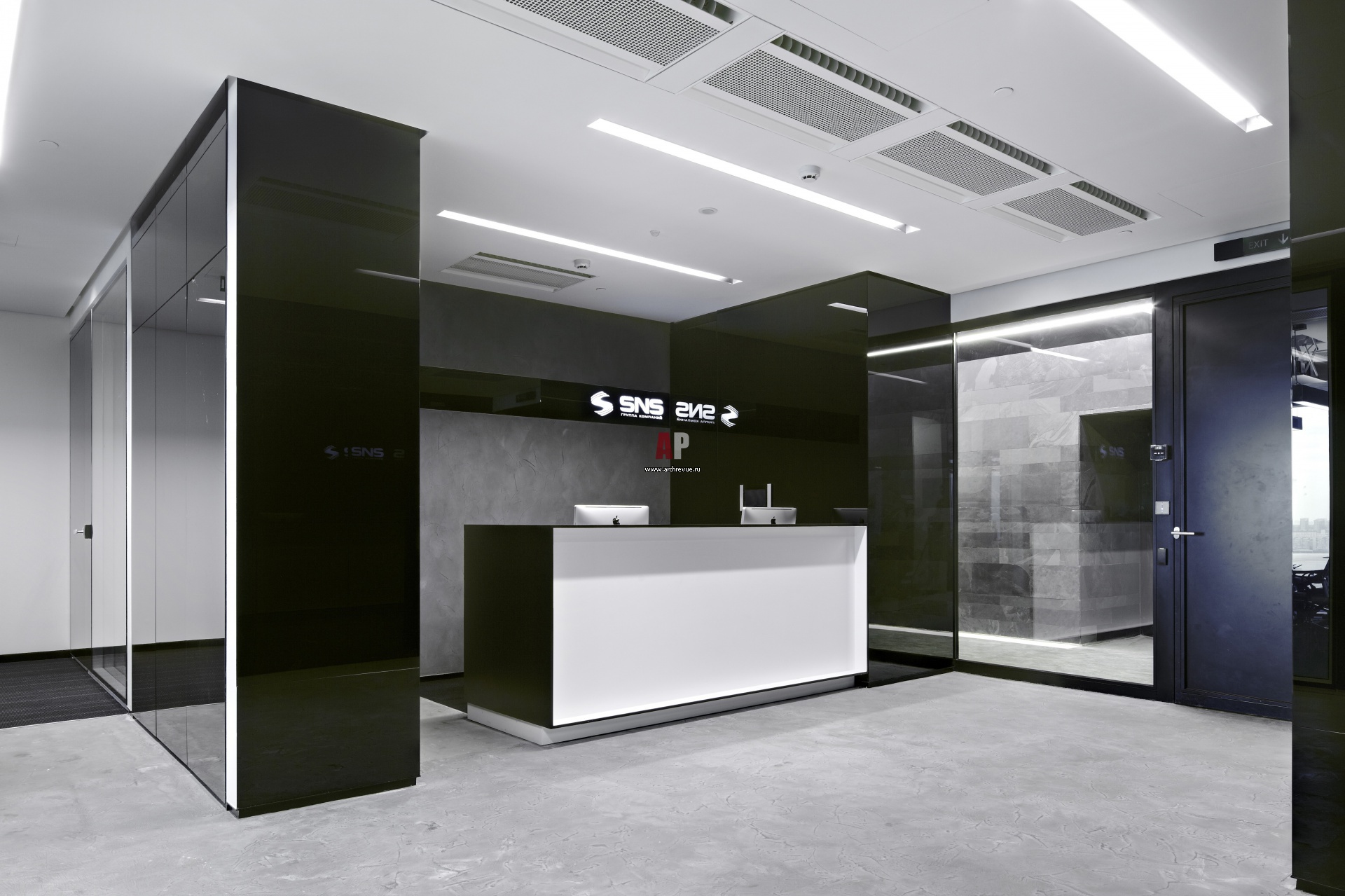 При входе в каждое из четырех рабочих пространств расположена рецепция – уменьшенная копия главной стойки. Пол выполнен из серого микробетона.