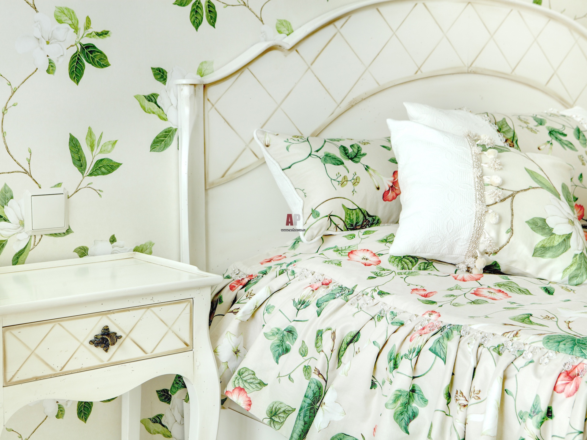 Фрагмент интерьера спальни. Текстиль с цветочным орнаментом и элегантная фурнитура – характерные особенности этого интерьера.