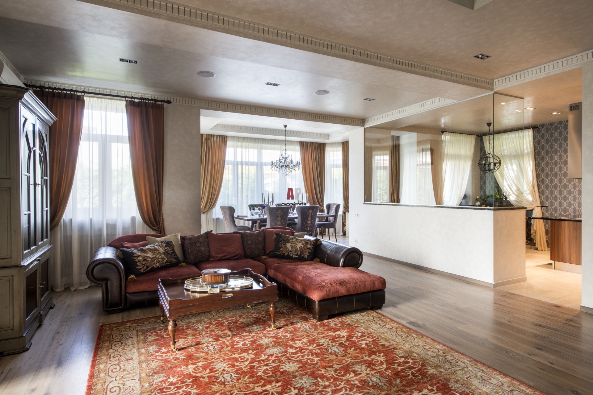 Кухня включена в общее пространство первого этажа. Она отделена барной стойкой и перегородкой из стекла.