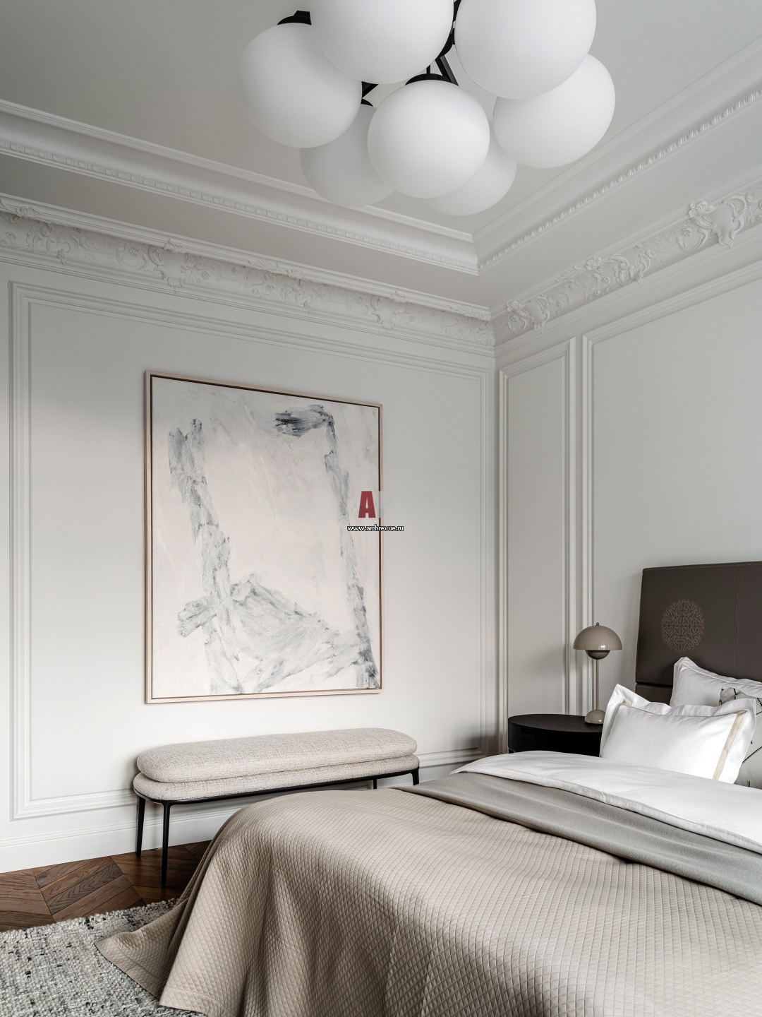 Квартира с парижским настроением для молодой пары. Интерьер спальни. Гипсовые карнизы сложной лепной работы привезены из Франции. На стене – картина Ивана Глазкова.