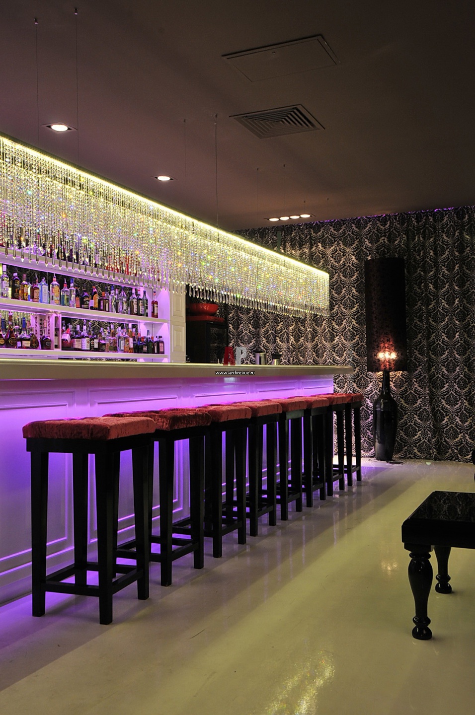 Длинная барная стойка зашита деревянными панелями со светодиодной подсветкой. Столешница из кориана. Светильник с ниспадающими нитями стразов. Они набирались вручную.